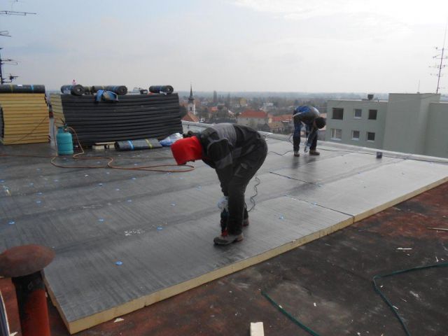 montáž hydro-thermo izolácie a vrchného bezudržboveho SBS pásu (zateplenie strechy)